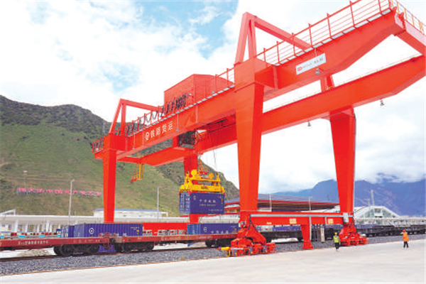 林芝站货场正在卸载集装箱。周悦翔 摄