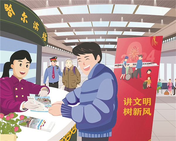 临近春运,哈尔滨站人潮涌动,一张张精心制作的文明出行宣传单,由铁路工作人员送到旅客手中。这既是一份文明出行倡议,又是一份旅游“打卡”攻略,潜移默化地播撒了文明出行的种子。