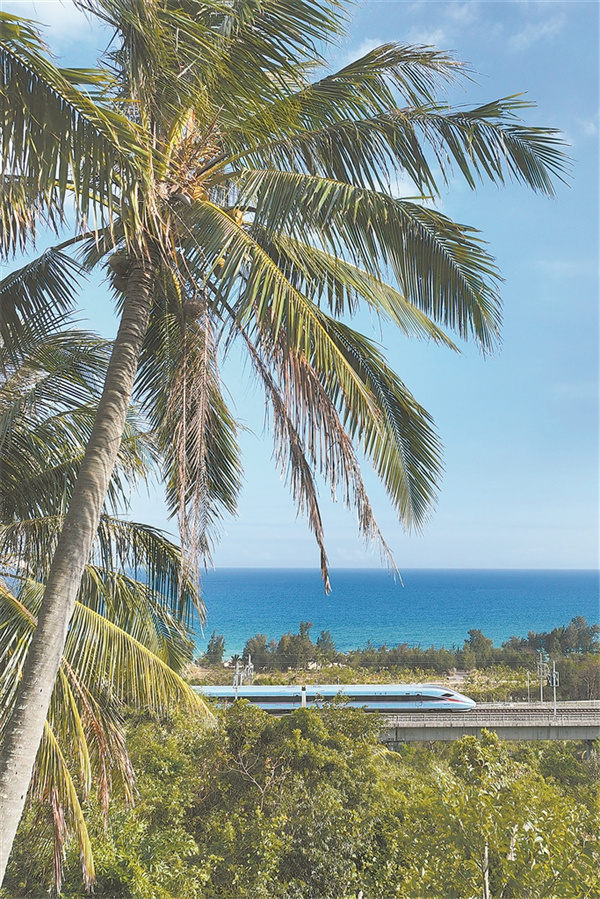 这条环岛而建的高铁在碧海蓝天之间蜿蜒前行,犹如一条灵动的纽带。随着高铁的延伸,车窗外的景色也在不断变换:从椰风海韵到热带雨林,从金色沙滩到翠绿山峦,不时掠过蔚蓝色大海、高大椰子树、成片槟榔树、宽阔的万泉河以及满坡的菠萝地……真是美不胜收。沿途每一次转弯都是一次新的发现,都会收获新的惊喜。我想,世上没有哪里的铁路会像海南环岛高铁这般令人心醉了。