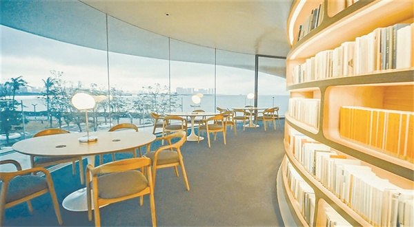 扫码进入,穿好鞋套,前行不过数米,立刻豁然开朗。10余层木质地板铺就的台阶从下向上延展,左右两壁嵌着书架,人们坐在台阶上,只需伸伸手就可以取到喜欢的书籍。阳光从头顶的孔洞上斜射下来,或照着书页上的字闪闪发光,或在人们的脸上惬意游移,或在地面上静静舒展。看书乏了,抬眼便是大海,让人心旷神怡。