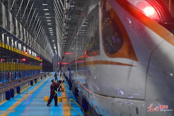 2021年10月5日凌晨,北京朝阳动车所职工对入库列车实时“洗澡”和“美容”,确保节日运输安全。(孙立君摄/光明图片)