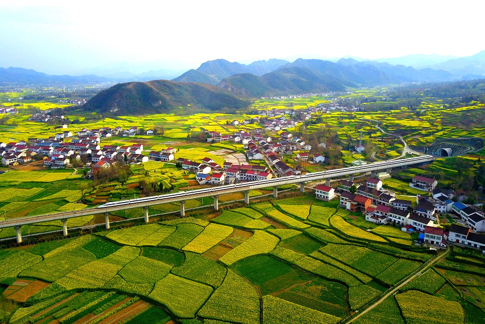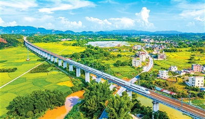 广西壮族自治区梧州市龙圩区龙圩镇念村,动车组从田野上飞驰而过,构成一幅生动的夏日乡村画卷。何华文摄(人民图片)