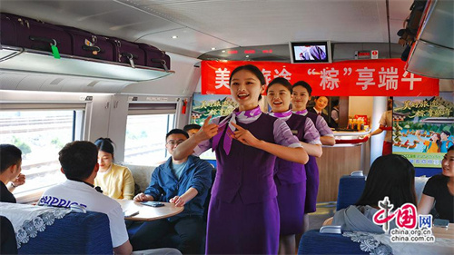 列车长齐慧颜身着整洁的品牌服,拿起话筒步入车厢中间,化身主持人向参加活动的旅客们讲述着端午节的来历和故事。“端午节是上古先民创立用于拜祭龙祖、祈福辟邪的节日,后因战国时期楚国诗人屈原在五月五日跳江自尽,后来人们将端午节作为纪念屈原的日子。”通过她简单明了的讲解,为旅客们普及着中国传统节日的含义,传承着对家国情怀的礼赞,为旅客们送上身体安康、事事顺利的美好祝福。