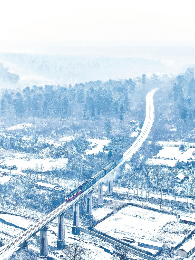 一列公益性“慢火车”行驶在冬雪覆盖的长白山区。