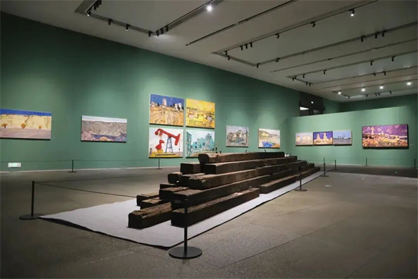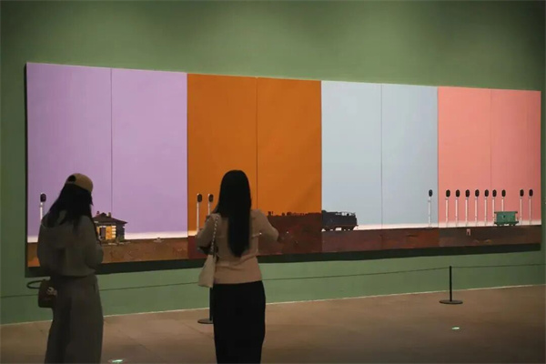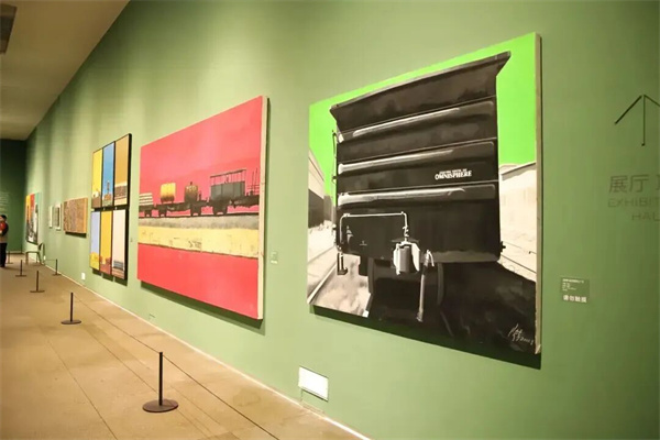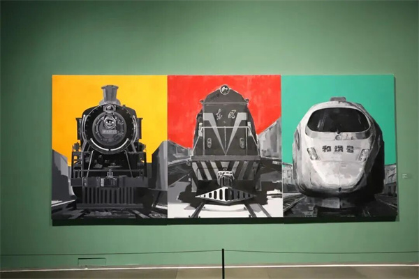 序厅以《奔腾·岁月》开篇,描绘中国铁路发展的重要阶段。作品中的机车主体以黑、白、灰为主色调,尽显硬朗雄厚的力量感;而背景的红、黄、绿三种高饱和度纯色,则为机械的冰冷感赋予了强烈的当代视觉冲击力。观众得以从中国铁路的巨变中,真切感受到中国的飞速发展和时代变迁。