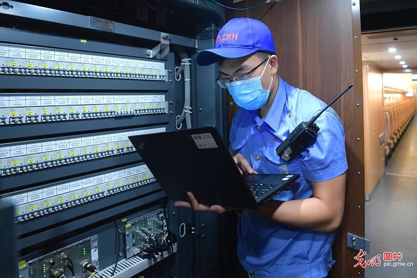 2021年10月5日凌晨,北京朝阳动车所职工对入库列...