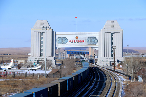 满洲里铁路口岸站,一列中欧班列从国门通过。国铁集团供图