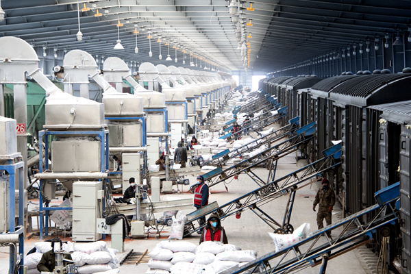 满洲里口岸站做好化肥等春耕物资装车。国铁集团供图