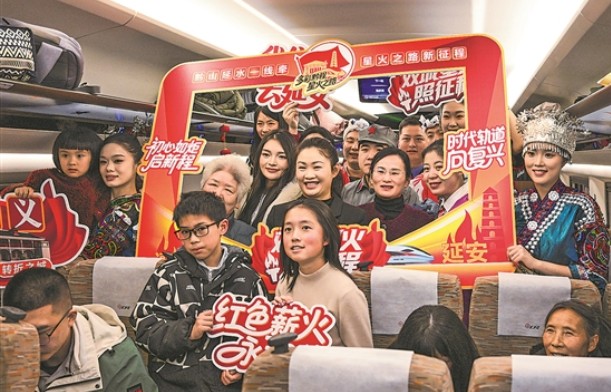 1月26日,旅客与乘务员在遵义开往延安方向的G3360次列车上合影。