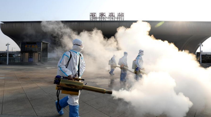 Staff members disinfect the Shijiazhuang Railway Station West Square in Shijiazhuang, north China's Hebei province, Jan. 31, 2021. Local authorities hav...