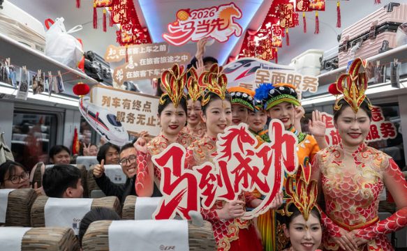 “快看!乘务员上场表演啦!”2月10日晚8时许,搭载869名乘客的D38次列车从汉口站驶出不久,音乐声便吸引了8号车厢内乘客的关注,一场特别的“列车春晚”在此拉开帷幕。