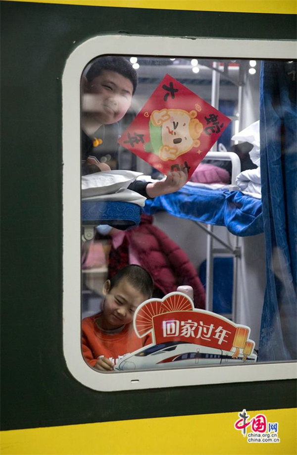 小朋友在车厢窗口期盼年味儿到来。中国网记者 马旷/摄