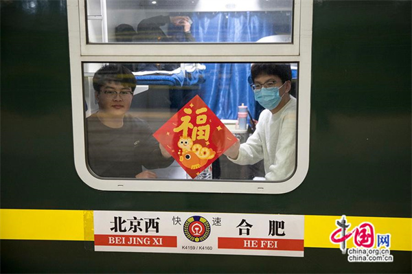 旅客在K4159次列车上展示福字。中国网记者 马旷/摄