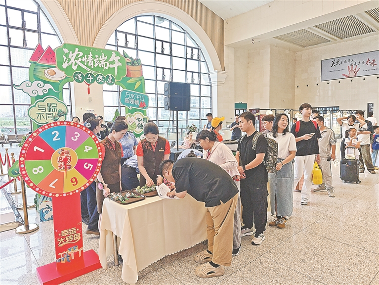 屈原故里,楚韵传情。宜昌车务段在宜昌东站候车室开展文化互动活动。活动在美妙的非遗音乐《后皇嘉树》中拉开序幕,通过展示荆楚特色的民族音乐快闪、《赛龙舟》《离骚》等经典曲目表演,推动“屈原故里 非遗端午”文化传播。车站工作人员向旅客发放艾草枝、五彩绳等纪念品,并邀请旅客体验包粽子、缝制香囊、编织五彩绳等非遗手工。“第一次在火车站感受到这么浓郁的端午节日气息,让我们的旅途备感愉悦。”来自无锡的旅客姚先生受现场氛围感染,主动上台用电吹管演奏歌曲《搀扶》,赢得热烈掌声。
