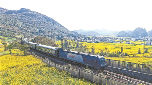 早春时节,云南罗平地区万亩油菜花竞相绽放。中国铁路昆明局集团有限公司动态优化旅客列车开行方案,全力满足旅客赏花出行需求。图为近日,满载旅客的列车行驶在南昆铁路罗平区段。杨紫轩 摄