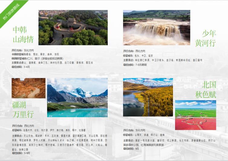 熊猫旅游列车中韩山海情”跨国旅游以及“少年黄河行”“疆湖万里行”“北国秋色赋”“远征额济纳”“狮舞南中国”“探幽光雾山”等特色主题旅游产品,丰富的旅游产品和优质的旅行服务收获了广大游客的好评。